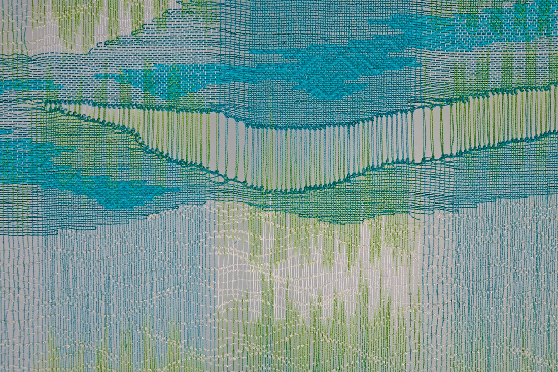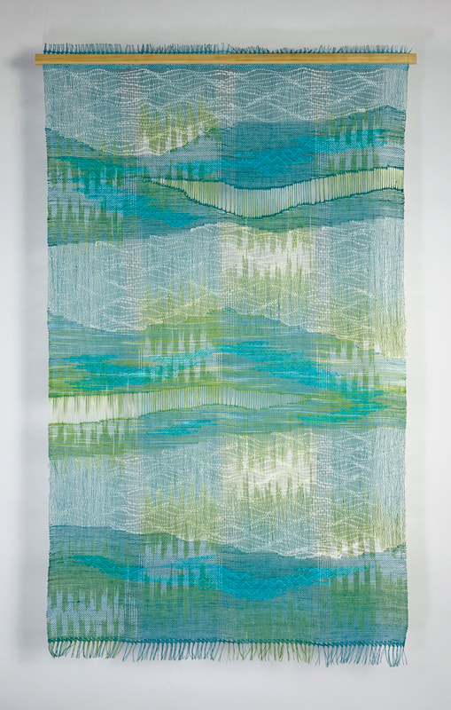 26"W x 43"H Transparent weaving hand-dyed linen, silk and rayon inlay, wood support Inspired by the presence of the sea that is so close to where I live, I embarked on a journey to explore physical density in various wave forms. It's impossible to foresee where such a journey will lead me. This one revealed imaginary islands floating in a shimmering sea. |
