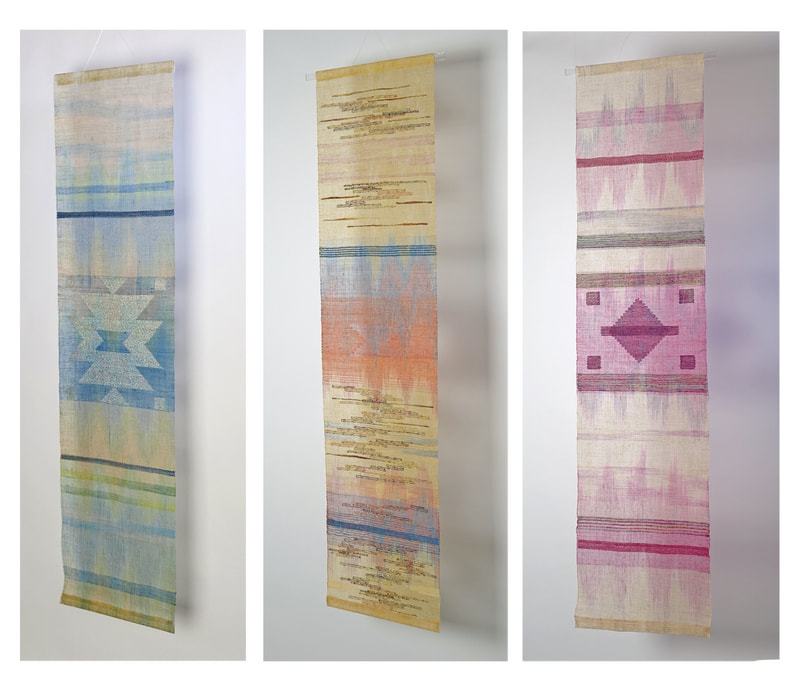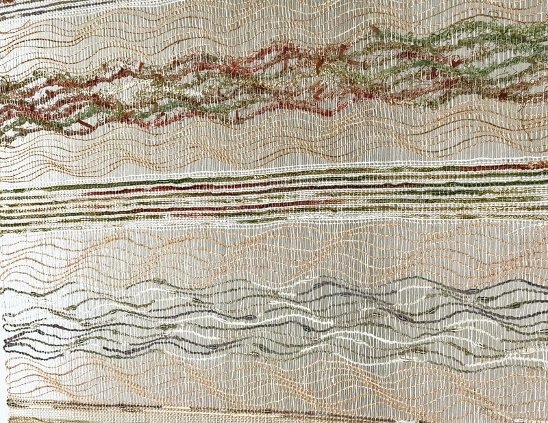 Transparent weavings feature a loosely woven background cloth that I weave with very fine linen. I inlay heavier threads during the weaving process to create designs and imagery. These weavings feel lighter than air. Click on each image to see various views.